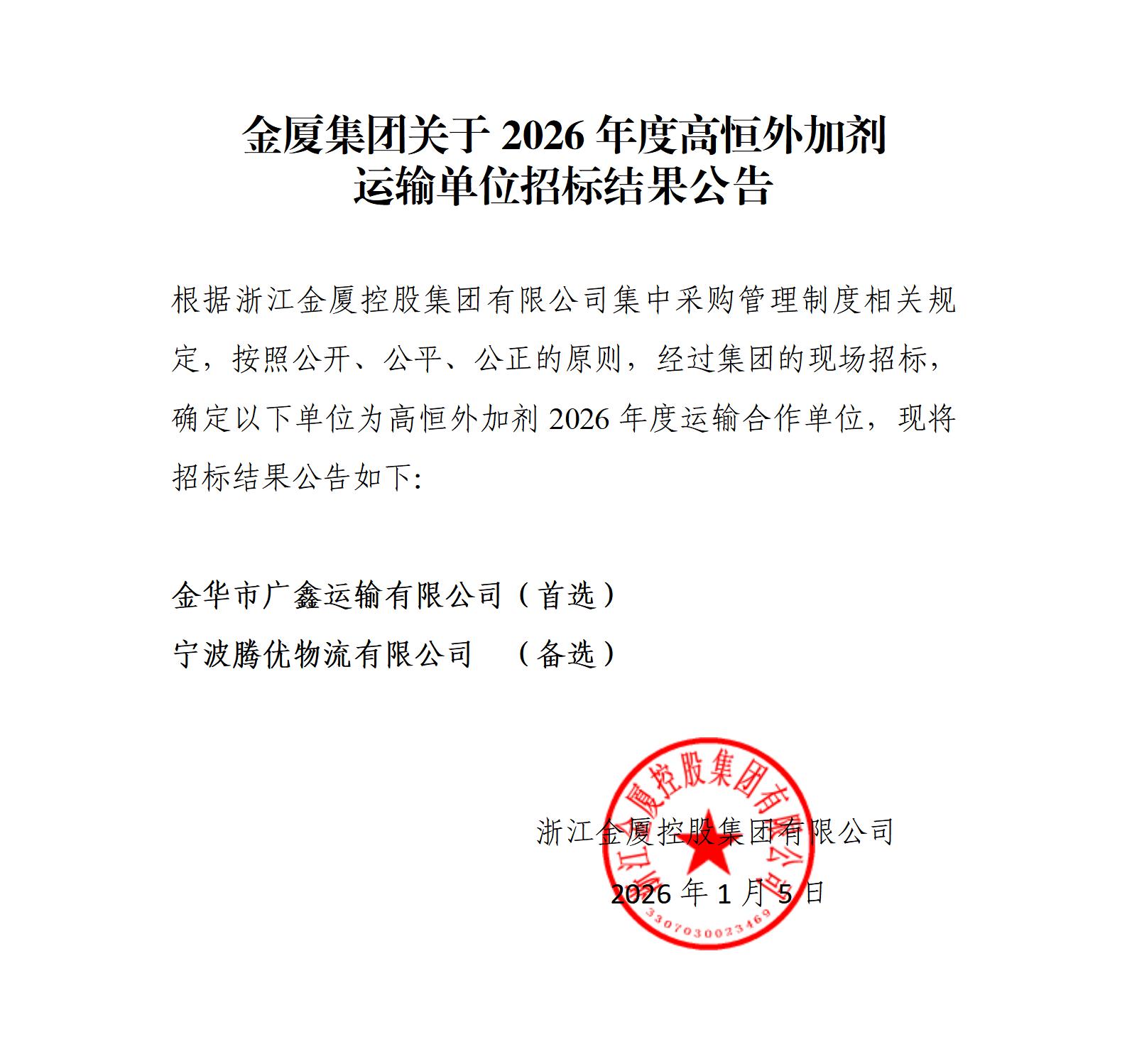 金廈集團(tuán)關(guān)于2026年度高恒外加劑 運(yùn)輸單位招標(biāo)結(jié)果公告